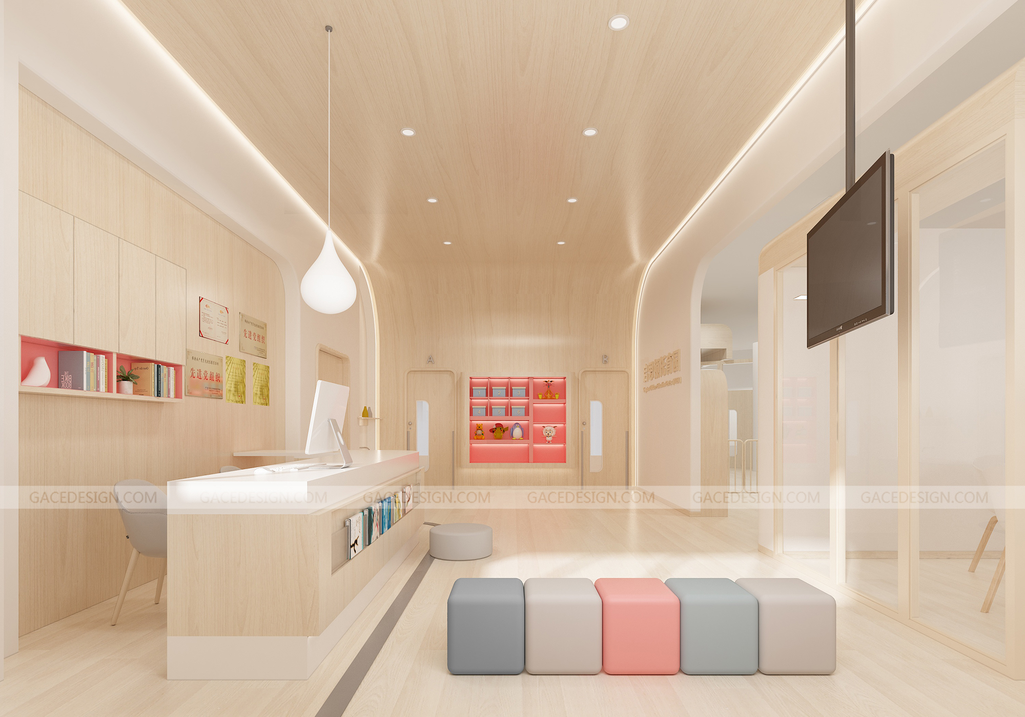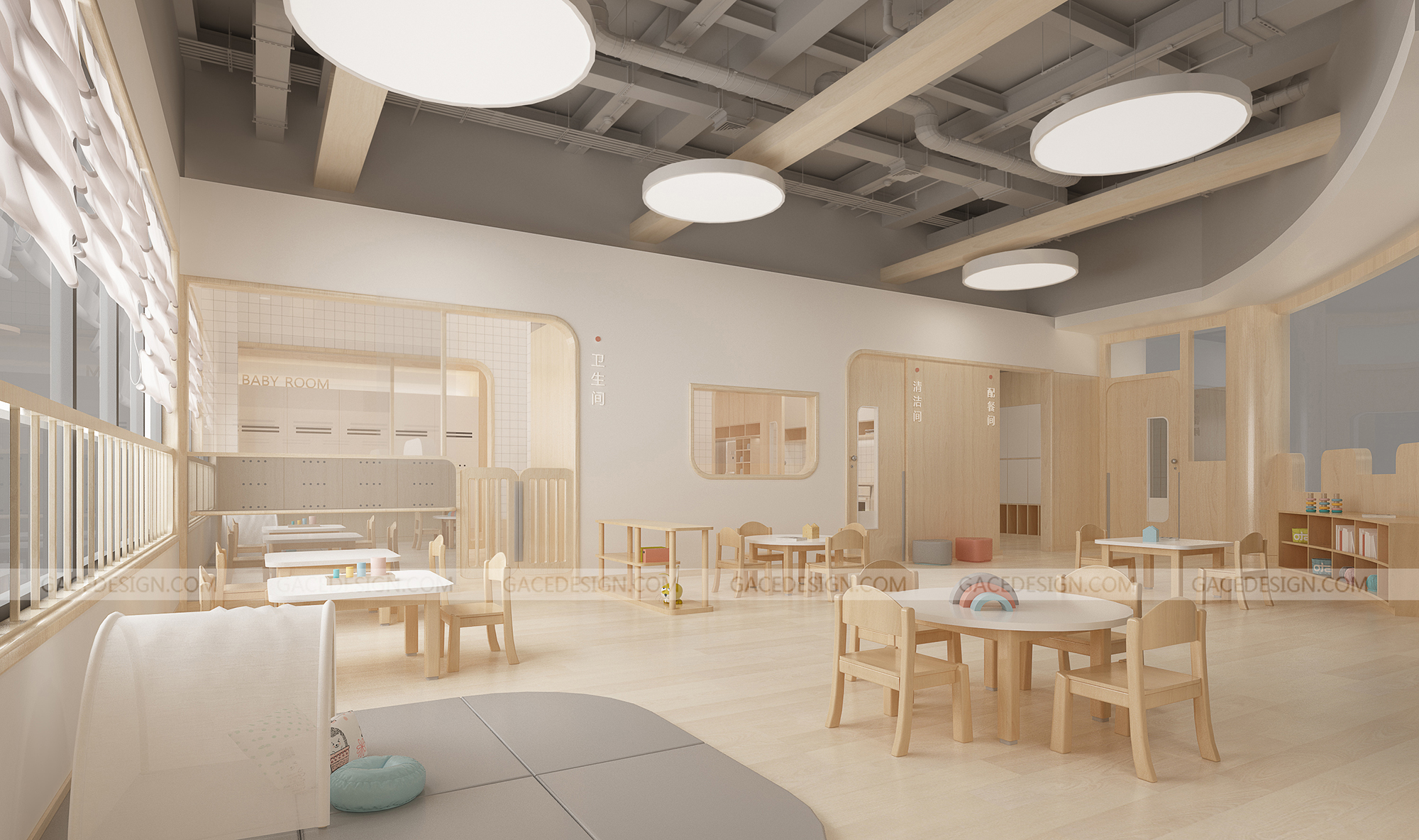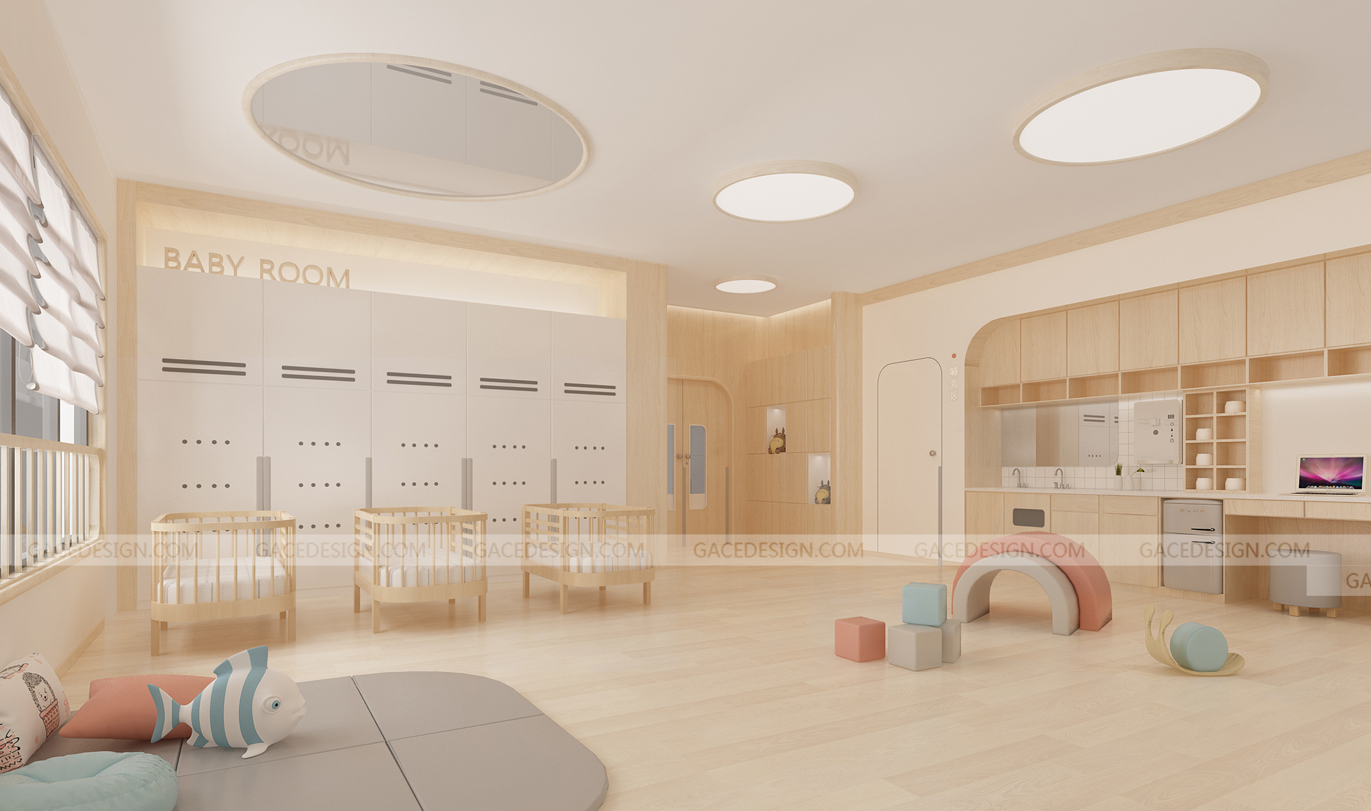 設(shè)計概括:這是我們幫啟思頓托育園設(shè)計的旗艦店,面積達到1000平以上,作為中山市高標準的示范性托育園,我們在設(shè)計之前組織設(shè)計師進行跟崗觀察,學習守護型嬰幼兒保育等系列保育書。考慮到保育員在操作層面上的便捷性,我們進行了場景模擬,把操作層面所涉及的柜體以及路徑進行了系統(tǒng)性整理。考慮到嬰幼兒在保育園的心理狀態(tài)以及發(fā)展心理學和空間敏感,我們定位這個項目是孩子的第二個家。是一家值得爸爸媽媽愿意托付的托育園。
