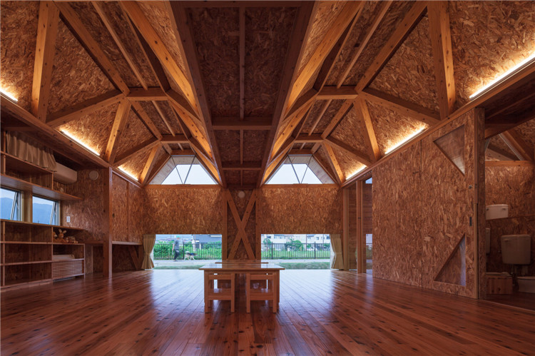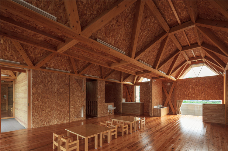 屋頂結構采用折疊板設計,無柱空間是通過運用木桁架梁屋頂結構實現的,形狀像一塊折疊板。所有支撐屋頂結構的承重墻都被布置在建筑外圍。現在這座建筑分成了兩個保育室、衛生間等,但將來也可以轉換為一個大房間。