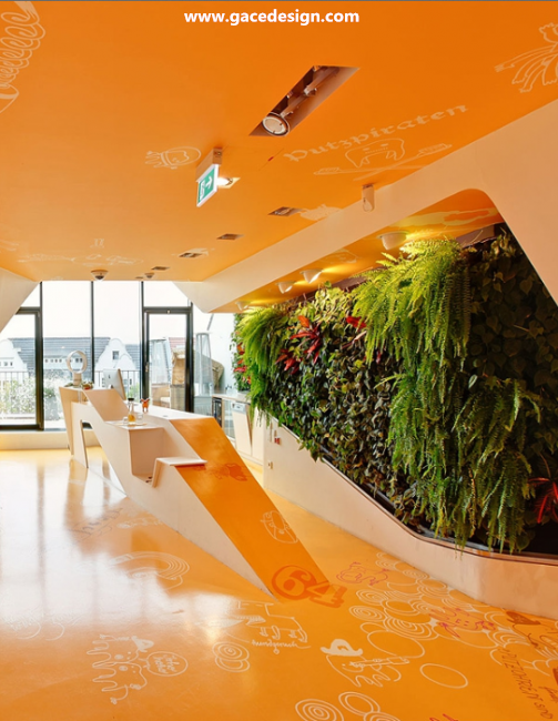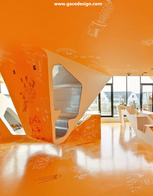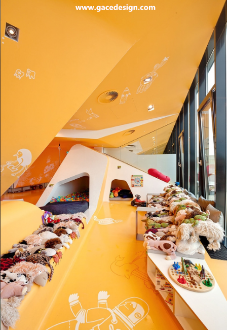 整個KU65 Kids Club的內部顏色選用來鮮亮的橙黃色與白色搭配,所有被“切開”的斷面皆為白色。桔黃色的表面上印有各種有趣的卡通圖案與涂鴉,甚至還有類似攀巖的墻壁。很難想象這里竟是一家醫療保健機構,所以項目名為KU65 Kids Club就容易理解了。幼兒園設計