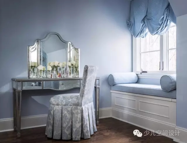 柔和的板藍色和銀色用來打造像公主一樣的宮殿。設計師給她設計一個特別舒適的窗口角落,也方便閱讀。從流動的瀑布式窗口處理的啟示進行概念設計的手繪壁畫。在床上,還定制了床罩和枕頭等匹配裝飾的家居用品。