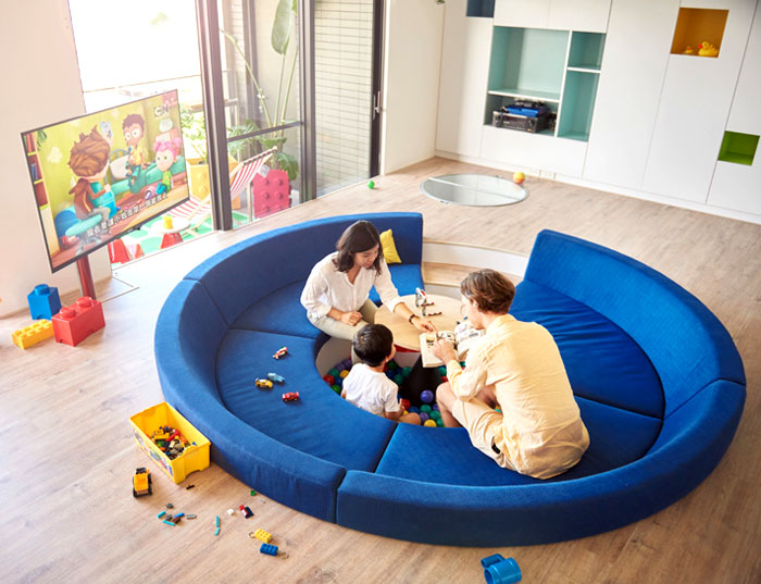 一般家庭最為重視的客廳區(qū)域卻被 HAO Design 改成了家庭活動區(qū),下沉式的藍色圓形沙發(fā)讓空隙處變成了一個游戲池,倒入海洋球,一家人的溝通從此處開始,可旋轉的電視讓任一角落都能觀看。整面的儲物柜讓雜物隱于無形,干凈整潔的空間更適合孩子的玩耍。(幼兒園設計)