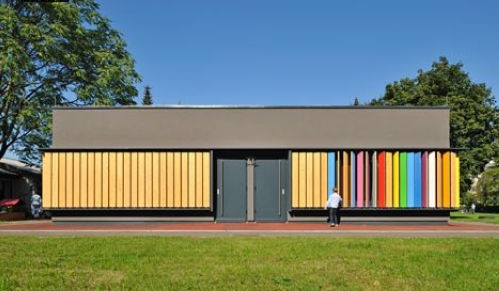 游戲室的一面墻與主樓相接,另外三面墻壁全部由木板組成,這些木板就如同百葉窗的葉片,可以繞著中央的金屬軸轉動。木板的一面保留木材的原色,另外一面總共刷上了9種鮮艷的顏色,拼在一起就像是彩色的琴鍵。