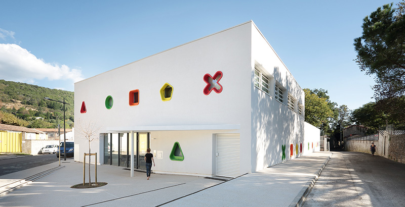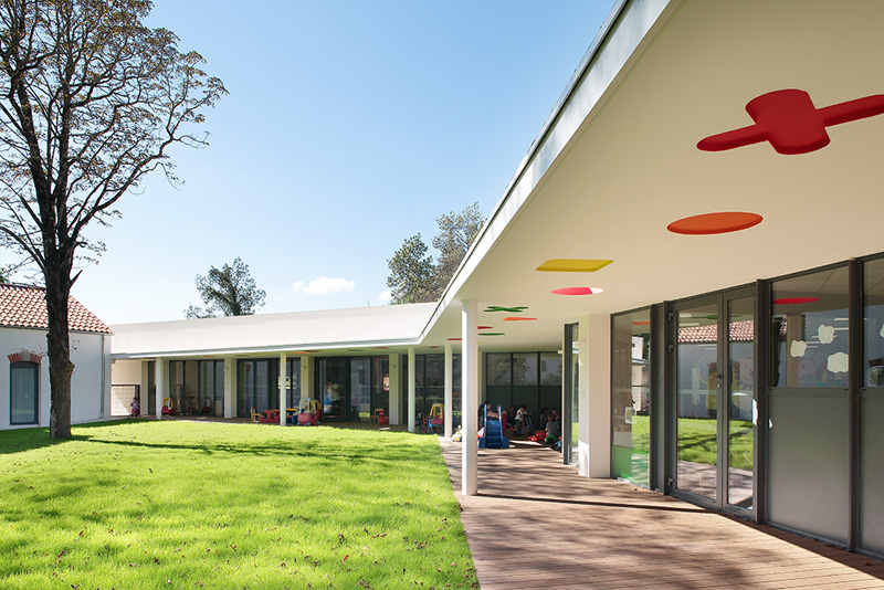 這個育兒中心是以之前的一個農(nóng)業(yè)部門改建而來,位于兩條狹窄的街道的街角之處,值得一提的是育兒中心與l’Ecureuil療養(yǎng)院建在一起:兩個建筑之間有一個漂亮的花園里面有很多栗子樹,增加了它們之間的聯(lián)系和代際關系。(幼兒園設計)