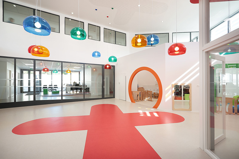 法國的一個育兒中心兒童空間,其設計非常有意思其特色是上面裝飾著不相同的顏色,和不同的類型玩具相似。