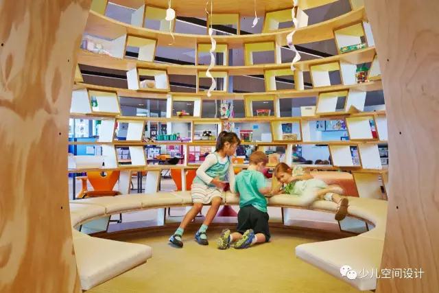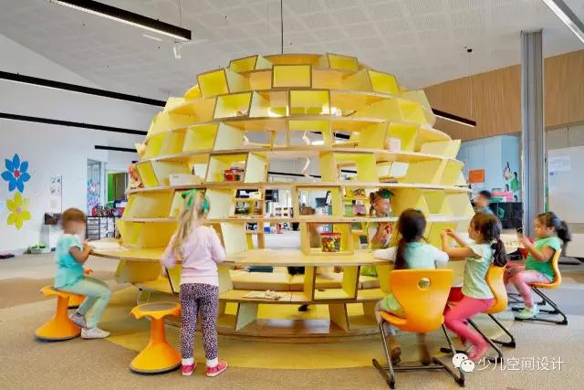 “蜂巢”還提供機會或交談空間。里面的座位為孩子們提供了“隱蔽的空間”,可以用來進行討論、玩游戲,或者只是在這里做功課。在“蜂巢”頂部開口有個圓形熒光燈,照明極佳。不同顏色的地毯也為“蜂巢”劃定“特殊”區域。