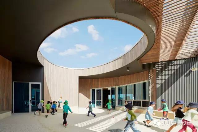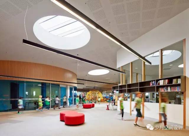 由于材質面板呼應色彩鮮亮的學生作品和家具,學校顯得熱情好客和溫暖;深色調與寬闊的玻璃相結合,增強了設施的透明度。大量插件板用于墻壁、地板和天花板,在廣泛的聲學處理中發揮關鍵作用,這是混合學習空間里必不可少的。(幼兒園設計)