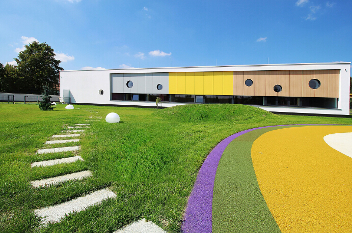在波蘭的Yellow Elephant幼兒園坐落在一片綠色的草坪上,有著五間房間能夠容下一百三十多名孩子卻只有一層的幼兒園,由白、黃、綠、紫的顏色構成的場地為孩子們提供了游戲場所。在藍天綠地的映襯下,這家幼兒園宛若一片置身于童話世界中的兒童樂園。