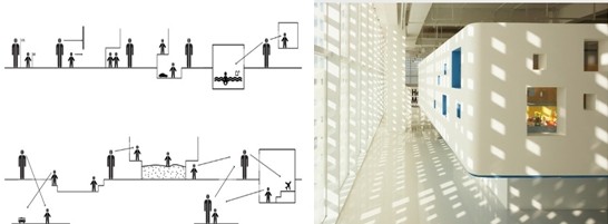 設(shè)計(jì)師首先考慮到兩種身高帶來(lái)的視角區(qū)別。因此在兒童內(nèi)部空間中設(shè)計(jì)一些專(zhuān)供兒童使用的低矮空間。就如同我們小時(shí)候爬假山的山洞,或者拿沙發(fā)墊子搭的城堡。另一方面父母還必須負(fù)起監(jiān)護(hù)的職責(zé),所以主要活動(dòng)室的設(shè)計(jì)升高到成人目光可以透過(guò)窗子平視的高度。這樣就更有利于家長(zhǎng)觀察孩子的動(dòng)向,設(shè)計(jì)師最終在大空間內(nèi)部搭起一系列“小盒子”。呈現(xiàn)出升高的教室,供家長(zhǎng)窺視的小窗,還有盒子底下只有孩子才能鉆過(guò)去的通道。我相信小孩們總會(huì)對(duì)這種特別的兒童空間設(shè)計(jì)感到興奮和安全感。