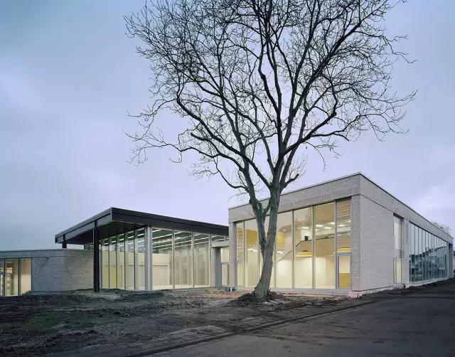 該幼兒園混凝土與明黃色的搭配高雅不失活力。雙翼構(gòu)造環(huán)抱住室外庭院,而大面積的落地玻璃窗讓室外美景滿滿映入眼簾。建筑一側(cè)外觀是磚飾面,另一側(cè)主要是玻璃幕墻外立面,混凝土結(jié)構(gòu),室內(nèi)直接暴露高精度清水混凝土,明黃色作為點綴色,讓幼兒園充滿活力