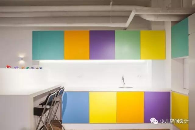就餐區(qū)和休息區(qū)是專門為家長和老師設(shè)計的兩個區(qū)域,他們可以在這里交流溝通孩子的情況。就餐區(qū)在功能上是一個帶有多重色彩櫥柜的敞開式廚房,它這樣的設(shè)計還可以激發(fā)孩子的興趣以及異想天開的想象力。就餐區(qū)的顏色都源自Babysteps的標(biāo)識中相同的色調(diào),與幼兒樂園整體的設(shè)計在視覺上形成統(tǒng)一,同時它也與整個室內(nèi)空間微妙的單色調(diào)相互協(xié)調(diào)。