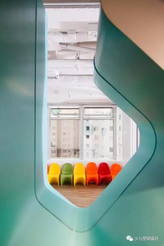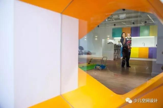 探索和運動區(qū)是幼兒樂園的重點區(qū)域。幼兒園室內(nèi)設(shè)計 在這個開放式的,明亮而怡人的活動區(qū),可以容納多種運動方式:純粹運動的方式、感知觸覺的方式、還有安靜的方式。一面帶有幾何圖案的彩色墻壁極具特色,這堵墻圍成了一個儲存區(qū)角,并且自然而然地將活動區(qū)內(nèi)不同方式的運動區(qū)分割開來。進(jìn)一步來說,這種分割還可以讓孩子和家長通過墻上幾何圖案的窗框看到教室里面的情景。
