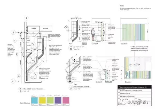 幼兒樂園的入口處設(shè)置了透明的玻璃門,純白色的金屬百葉窗,簡潔利落的百葉窗顯得美觀大方。入口的一側(cè)還設(shè)有接待臺,同樣是由柔和彎曲的彩色百葉窗造型設(shè)計而成。Babysteps的標(biāo)識置于接待臺后面的墻上,五彩的字體設(shè)計更顯活潑可愛。燈光打在百葉窗上形成微妙的光影,使得BabySteps產(chǎn)生了一個工藝的視覺形象。