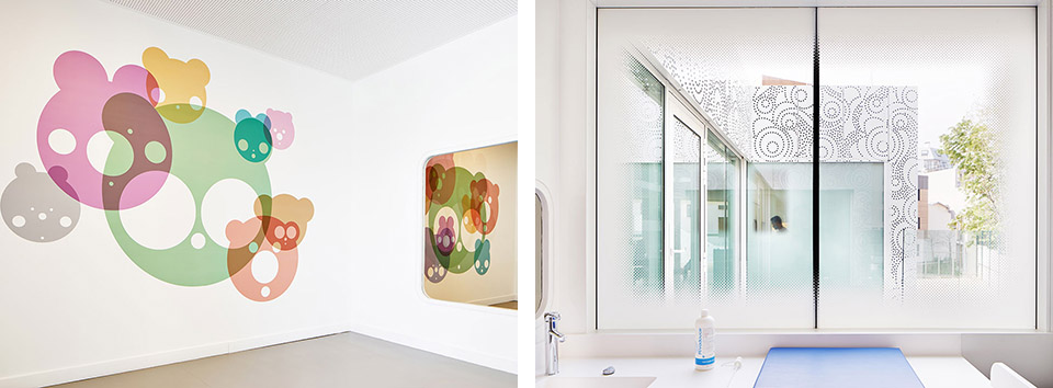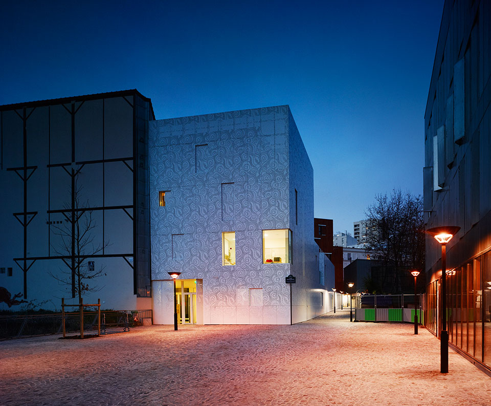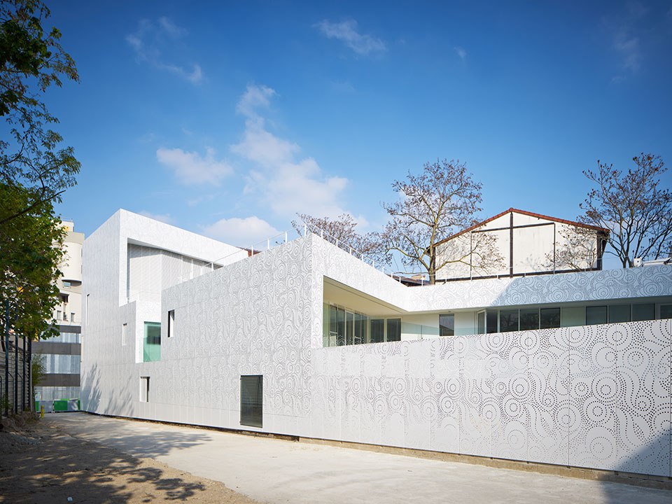 法國建筑事務所Avenier Cornejo設計的巴黎20區幼兒園建成,這所可容納66個孩子的幼兒園是一座獨特的建筑,為兒童提供安心的環境。建筑以混凝土為結構,滿滿占據著三角形地塊,并沿兩側邊緣開了三個內庭院,為建筑提供充足的陽光與光線。建筑周身覆蓋有著美麗花樣的金屬穿孔板。這層金屬外表皮還覆蓋了部分窗戶,為其提供過濾的光,并在夜晚像燈籠一樣透光。傍晚來臨的時候,兩旁的路燈亮出詳和的燈光,好像都在刻意討好這所幼兒園。它就像一位非常漂亮文雅的姑娘,周圍建筑和路燈都是敗在它的石榴裙下的紳士! 此幼兒園的顏色和圖紋,與周圍建筑想必是那么與眾不同,一下子就能夠把人們的目光吸引住了。