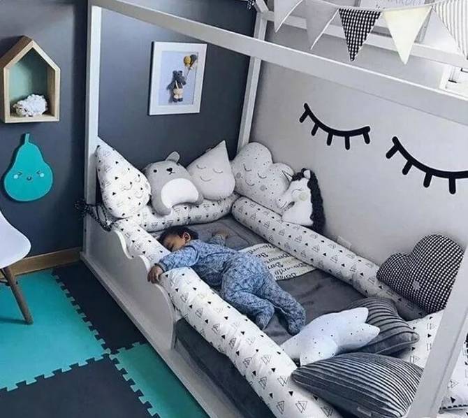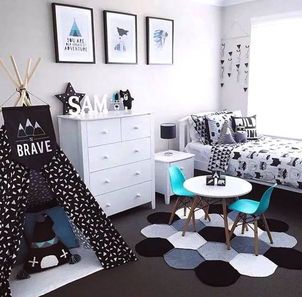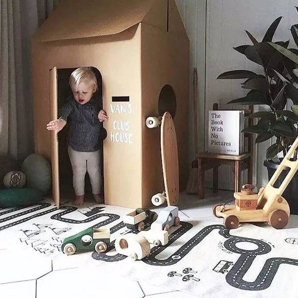 房間里還可以設置一些簡易的玩樂設施。1-3歲的孩子需要父母的時刻陪伴,我們可以在房間或者客廳放上爬行墊+安全圍欄給孩子一個小區(qū)域領地,把這里變成一個親子小游戲區(qū)。在兒童房里也可以在地面貼上玩具貼紙,把局部地面變成孩子的游戲地圖,適合在游戲中培養(yǎng)孩子創(chuàng)造力和分享的意識,留出空間,讓孩子可以和朋友或者和父母一起玩玩具,孩子1歲之后我們可以適當添置一些矮柜來收納玩具,還可以讓孩子扶著學走路。在兒童床上加一個木架結(jié)構(gòu),把床做成木房子,給孩子一個開放的獨立空間。這種具象的區(qū)域不僅會給孩子安全感,還能滿足他們的探險欲,