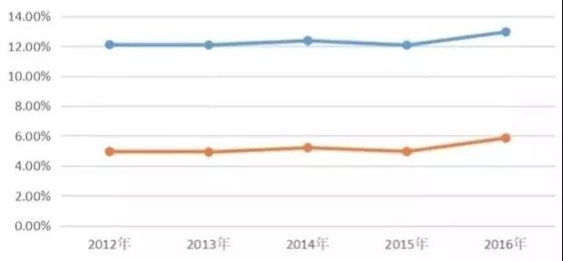 上述圖表是2012年-2016年中國人口出生率和自然增長率概況。出生率在2014年曾出現(xiàn)小幅上漲達到12.37‰,2016年漲幅較大達到12.95‰,其余時間無明顯變化,均維持在約為12‰的水平。