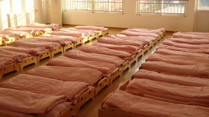 為節(jié)省面積,便于使用,幼兒園床位排列常采用兩床相靠或成組排列方式,但并排床位不應(yīng)超過(guò)2個(gè),相接床位不宜超過(guò)4個(gè)。