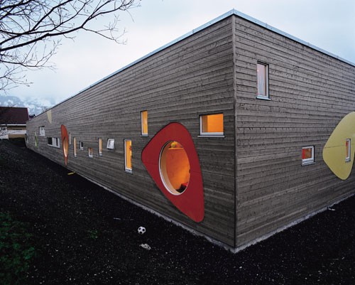 幼兒園建筑外表皮材質由天然木材堆砌而成,保留了天然的木材紋理,如同通話中溫柔善良的女孩的木屋;高低錯落的窗戶依照兒童的尺度進行設計,鮮艷的色彩和透出的暖黃色燈光溫暖了這個冰冷的北極冰雪世界,仿佛是一雙雙好奇地觀察這大千世界的眼睛。