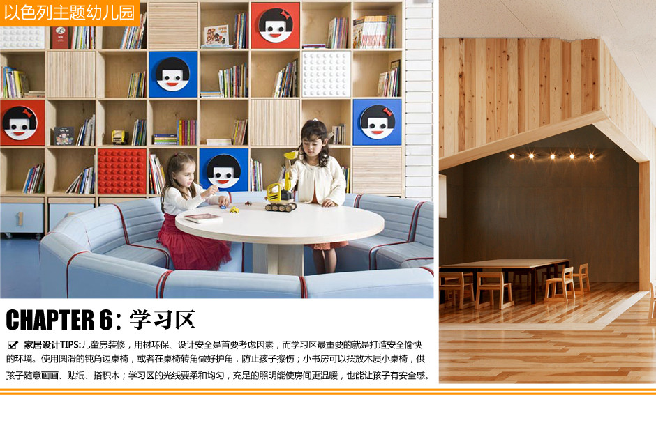 3、這是幼兒園的其中一間教室,低矮的花型座椅散亂分布在教室四處,立體紅蘋果懸掛在樹形的模型上,黑板上懸掛著松樹圖案的浮雕。微型帳篷安放在教室的中心區域,里面填滿了紅白兩色的乙烯基塑料填充物,悅目的色彩給童年增添了不少生動的記憶。
